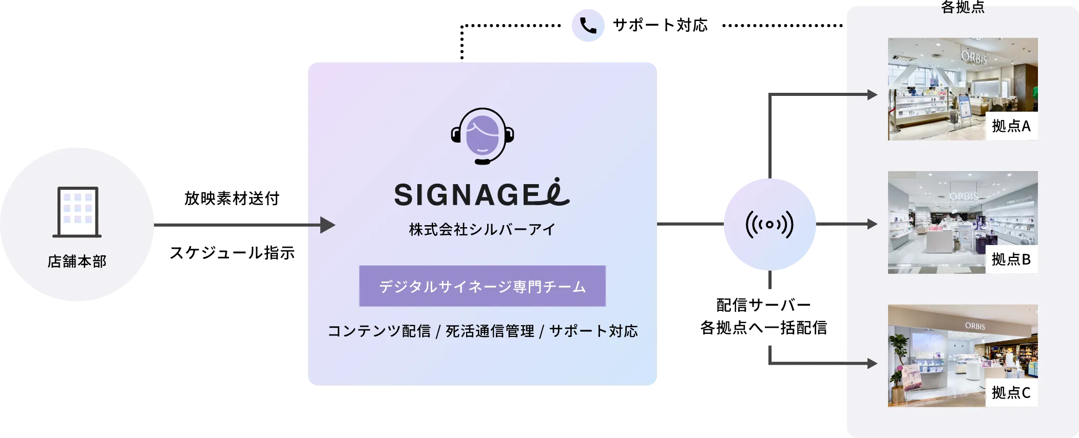 弊社に専門のサポートセンターを設け、サイネージ導入店舗へのコールサポートをおこなっております。導入後のアフターフォローも充実。 -